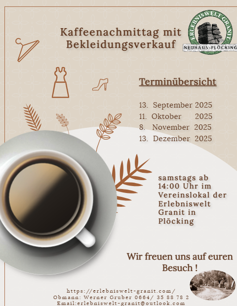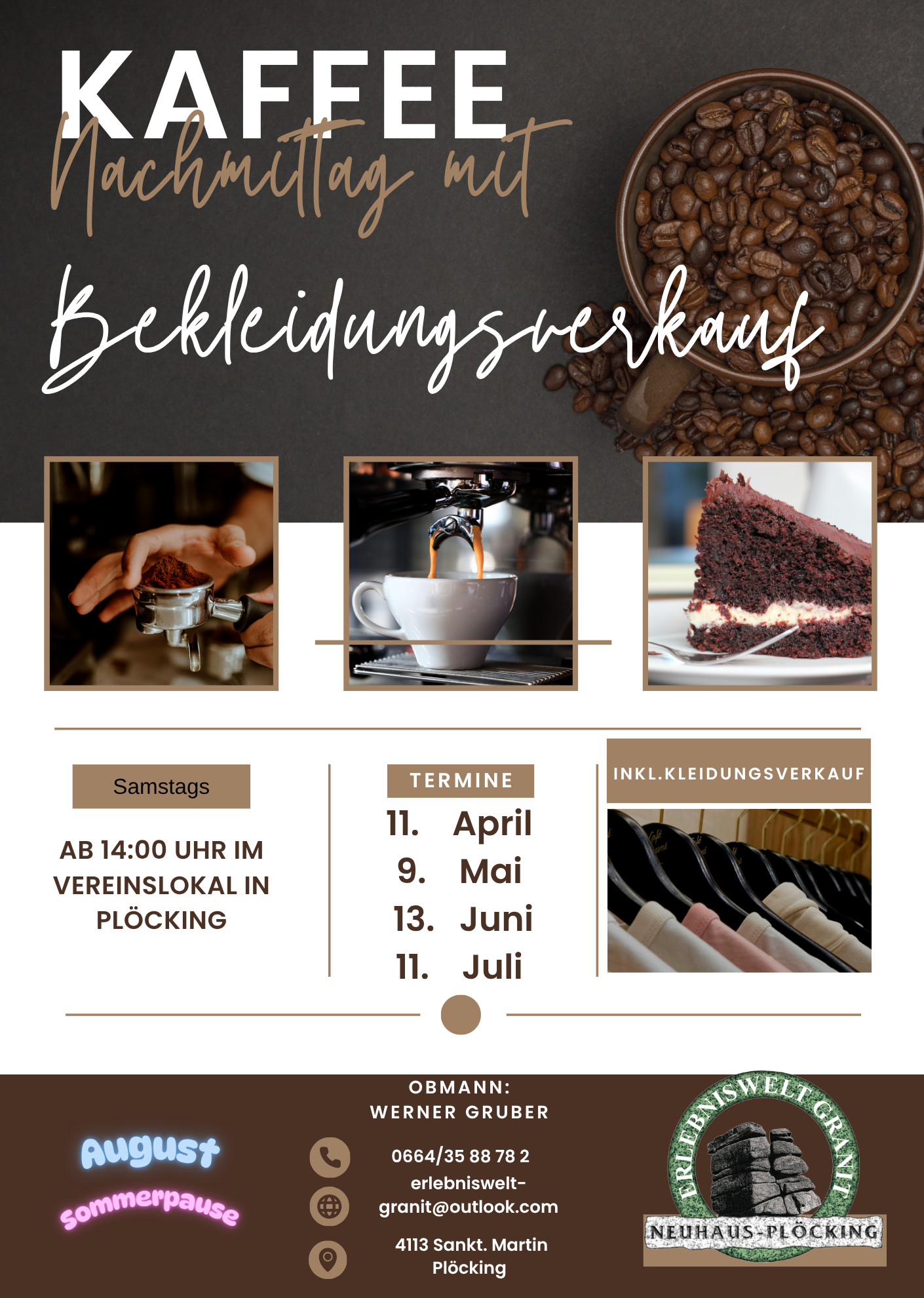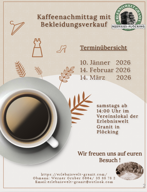 Es wird zu einem gemütlichen Kaffeenachmittag mit Bekleidungstausch oder -verkauf in das Vereinslokal nach Plöcking eingeladen.